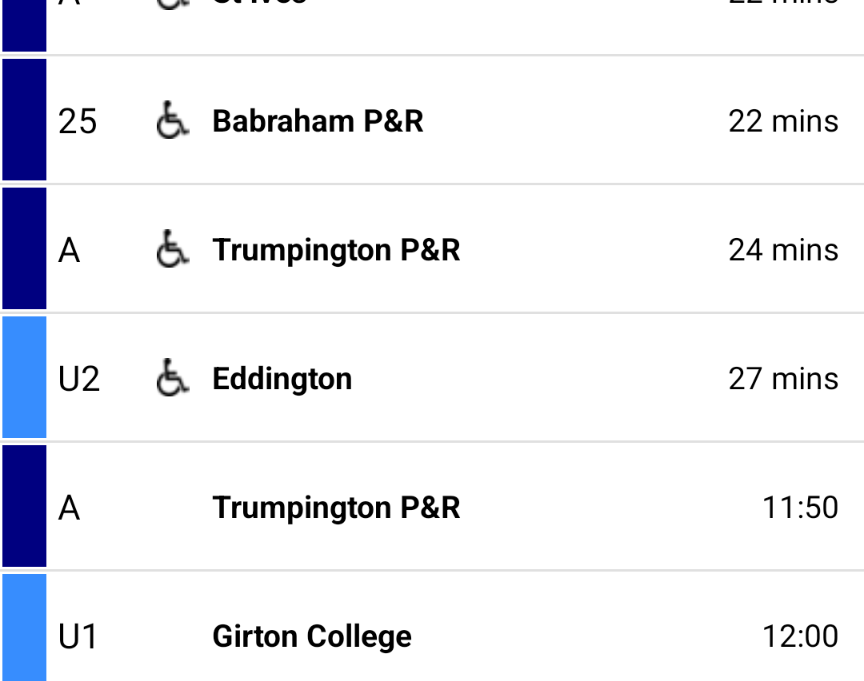 - Shows real or timetabled time (if the bus has not begun yet OR is not sending its signal) – like the realtime information at bus stops.