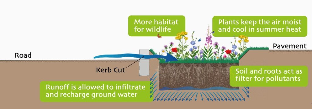 Earlier this year WSC did a pilot project in Fallowfield, Cambridge, a junction which is under water for half a day after very heavy rain. This was low cost, low effort – the kerb was cut in three places and the verge dug. Compost-rich soil was put into the holes, and neighbours helped plant perennials (which have bigger root systems and can survive drought) and sow wild flowers. Water fills up one pool at a time then runs on to fill the next. Compost makes the soil more absorbent :the soil’s capacity to hold moisture goes up exponentially with the amount of organic matter. Plant root systems bring micro-organisms which break down pollutants so the water is cleaner when it enters the water table.