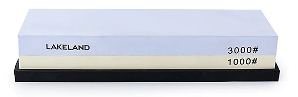 Sharpening stone (whetstone)* – Must soak in water first – won’t work if not wet. The numbers refer to the grit (like sandpaper) – the higher the number the finer the grit. Start with the coarser side. (Use the rubber foot to hold it to the table, and an old tea-towel to mop up splashes!) Push the knife along the stone – doesn’t need to be fast, but apply gentle pressure.
